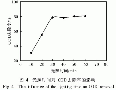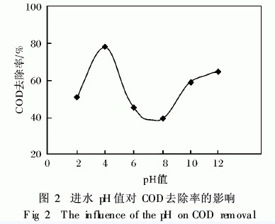 由圖2可知,進(jìn)水pH在4時, COD去除率較 高,達(dá)到80%。這是由于在酸性條件下,一方面,帶 正電的催化劑表面有利于光生電子向催化劑表面的 遷移,與表面吸附的電子受體O2(ads)反應(yīng)生成 O2-,抑制光生載流子的復(fù)合;另一方面,也有利于 體系中帶負(fù)電荷的有機分子向催化劑表面遷移和吸 附,使反應(yīng)速率提高。在接近中性時, COD去除率 較低,因為顆粒大小、表面負(fù)荷、TiO2能帶位置都受 pH的強烈影響,且跟TiO2在純水中等電點在6左 右有關(guān)。