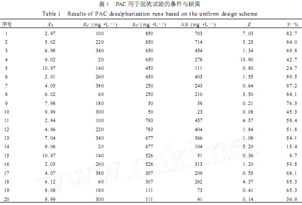 篩選了PAC作為脫硫絮凝劑,對其脫硫效果進行了較全面的研究。采用均勻設計法,對PAC投加量、原水pH和含硫量進行了考察。試驗共選用3因素10水平。含硫量采用擬水平。選用均勻設計試驗表為U10(102×5),D(均勻設計系數(shù))為0.1878。