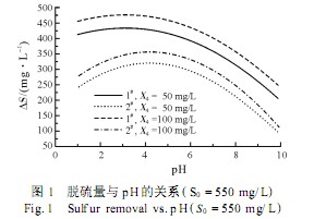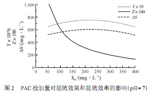 pH對脫硫量的影響見圖1。從圖1可見,pH對脫硫量有較大的影響,且存在最佳值。根據(jù)圖1推測以及式(8)、式(9)、式(11)和式(2)的計算可知,不同的PAC投加量時,Y(Z)—pH曲線也是一組平行線。