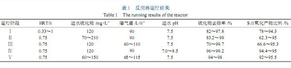 流化床連續(xù)進(jìn)水4d后,載體表面開始有生物膜生長,此后15d內(nèi),反應(yīng)器的水力停留時(shí)間(HRT)從3.7h降低到1h,進(jìn)水硫化物(S2-)從50mg·L-1提高到120mg·L-1,進(jìn)水COD控制在250~300mg·L-1之間,曝氣量從75L·h-1提高到90L·h-1,進(jìn)水pH控制在7.5~8.5之間。反應(yīng)器運(yùn)行到第19d時(shí),HRT為1h,COD和硫化物負(fù)荷分別為7.5kg·m-3·d-1和3.0kg·m-3·d-1,去除率分別為78.3%和92.62%,出水為乳白色渾濁狀,生成了膠體狀的單質(zhì)硫顆粒,出水pH升高0.5左右。同時(shí),根據(jù)顯微鏡觀察,發(fā)現(xiàn)生物膜結(jié)構(gòu)由絲狀菌和菌膠團(tuán)組成,微生物相對(duì)比較豐富,說明生物膜馴化成功。從第20d起反應(yīng)器正常運(yùn)行,開始正式試驗(yàn)。試驗(yàn)廢水溫度為18~21℃,進(jìn)水COD確定為350mg·L-1左右。試驗(yàn)分為五個(gè)階段,第Ⅰ階段研究HRT對(duì)生物氧化廢水中硫化物的影響,第Ⅱ階段研究進(jìn)水硫化物濃度的改變對(duì)反應(yīng)器處理效果的影響,第Ⅲ階段研究不同曝氣量對(duì)反應(yīng)器處理效果的影響,第Ⅳ階段研究進(jìn)水pH的改變對(duì)反應(yīng)器處理效果的影響,第Ⅴ階段研究進(jìn)水硫化物濃度和曝氣量對(duì)反應(yīng)器運(yùn)行效果的綜合影響。Ⅰ~Ⅳ階段各歷時(shí)12d,第Ⅴ階段歷時(shí)20d。反應(yīng)器整體運(yùn)行情況見表1。