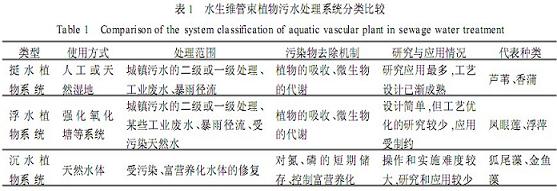 凡生長在水中或濕土壤中的植物,以大型的草本植物為主,包括水生、濕生和沼生植物,稱為水生植物(hydrophyte)[5]。水生植物主要包括3大類:水生維管束植物、水生蘚類和高等藻類。在污水治理中應(yīng)用較多的是水生維管束植物,它具有發(fā)達(dá)的機(jī)械組織,植物個(gè)體比較高大,可分為挺水、浮水和沉水3種生活型[6],這3種類型的水生植物在污水處理系統(tǒng)中存在一些不同的應(yīng)用方式,詳見(表1)。