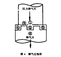 釋放器的釋氣過程見圖4 。 溶氣水進(jìn)人孔口①.固突然收縮并即行擴(kuò)大.降低部分壓能而加速空氣分子的逸出接著水流在孔室②內(nèi)撞擊、形成渦流而產(chǎn)生劇烈的紊動(dòng)而繼續(xù) “ 消能” 釋出的空氣分子在分子擴(kuò)散和紊流擴(kuò)散 的作用下 .逐級(jí)并形成超微氣泡 。當(dāng)水流急速轉(zhuǎn)入平行圓盤的縫隙③時(shí). 流態(tài)驟變, 在極窄的狹逢進(jìn)口處, 水流斷面再次急劇收縮 , 紊動(dòng)程度更為劇烈 , 并出現(xiàn)局部真空 ,其液膜減薄及表面更新速率達(dá)到頂點(diǎn)。至此,空氣分子幾乎全部釋出, 并沿圓盤徑 向迅速擴(kuò)散而使超微氣泡繼續(xù)并大直至在④⑤處形成微米級(jí)的微氣泡而出流。 此時(shí)溶氣水的壓能已損耗 9 5 %左右, 余船在管嘴⑥內(nèi)繼續(xù)產(chǎn)生紊流而使微氣泡在紊流擴(kuò)散運(yùn)動(dòng)影響下 “ 并大” , 而使溶氣水變?yōu)獒寶馑。整個(gè)過程耗時(shí)不到 0 . 3 S 。