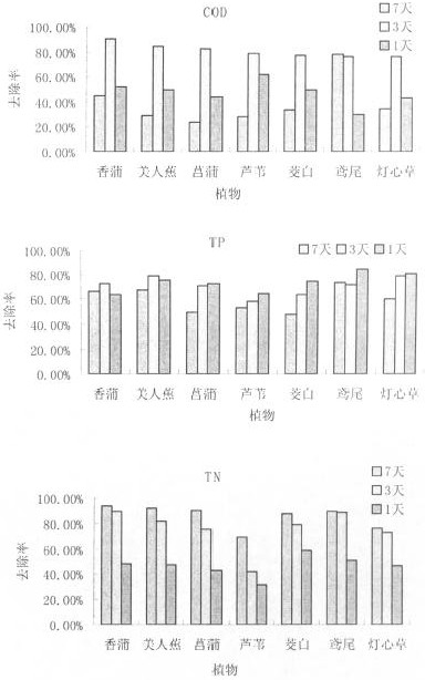 | 圖1 各種植物在停留時間為7天,3天和1天時分別對CODcr、TP和TN的去除率 |