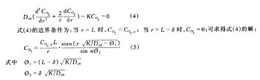 由于基質(zhì)擴(kuò)散所需要的反應(yīng)時(shí)間比微生物生長(zhǎng)的特征時(shí)間要小好幾個(gè)數(shù)量級(jí),故相對(duì)于微生物增殖來(lái)說(shuō)基質(zhì)在生物膜中的分布可認(rèn)為處于穩(wěn)定狀態(tài)。另外,理論和實(shí)驗(yàn)均已證明,當(dāng)氧氨比<3.4時(shí),溶解氧將成為反應(yīng)的限制性因素[11]。因此,當(dāng)液相中溶解氧的濃度<2.5mg/L時(shí),氧就是硝化反應(yīng)的限制基質(zhì)[1]。所以,在生物膜中溶解氧的擴(kuò)散—反應(yīng)方程為: