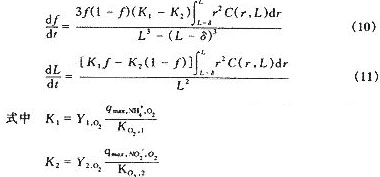 對(duì)于硝化生物膜,考慮其生物種群僅為氨氧化菌和亞硝氧化菌兩種,如果某一時(shí)刻氨氮化菌在微生物膜中所占的體積分率f1=f,則亞硝酸氧化菌在微生物膜中所占的體積分率f2=(1-f),將式(7)、(8)(9)聯(lián)立可以寫(xiě)成以下形式: