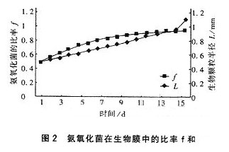 通過(guò)基質(zhì)降解和生物膜生長(zhǎng)兩過(guò)程的計(jì)算,可以得出在一定條件下生物膜結(jié)構(gòu)和生物顆粒半徑隨時(shí)間的變化關(guān)系。圖2給出液相主體溶解氧濃度Cp=0.5mg/L,活性生物膜厚度δ=50μm時(shí),氨氧化菌在生物膜中的比率f和生物顆粒半徑L隨時(shí)間的變化。