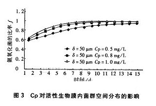 從圖3可以看出,當(dāng)活性生物膜的厚度保持不變時(shí),液相主體濃度Cp越大越有利于氨氧化菌的競(jìng)爭(zhēng)生長(zhǎng),氨氧化菌在較短的時(shí)間內(nèi)就可以達(dá)到較高的比率,也就是可以在較短的時(shí)間內(nèi)完成氨氧化菌與亞硝酸氧化菌之間的選擇競(jìng)爭(zhēng),從而可在較短的時(shí)間內(nèi)實(shí)現(xiàn)出水亞硝酸鹽的高積累。液相主體的溶解氧濃度越高,通過(guò)分子擴(kuò)散進(jìn)入生物膜內(nèi)部特定位置上的溶解氧濃度也就越高,由于氨氧化菌對(duì)溶解氧的親和力比亞硝酸氧化菌對(duì)溶解氧的親和力要強(qiáng),導(dǎo)致的氨氧化菌生長(zhǎng)速率的增加比亞硝酸氧化菌生長(zhǎng)速率的增加要大,使競(jìng)爭(zhēng)過(guò)程更為顯著。