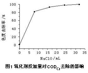 從上圖1可以看出,加入了氧化劑,CODCr的值反而增加了,并且隨著氧化劑用量的增加,CODCr值逐漸增加。這是因?yàn)镹aClO使染料分子的偶氮鍵斷裂,原來(lái)的大分子變成小分子,有利于K2Cr2O7的氧化從而使CODCr增高;從上圖2可以看出,加入了氧化劑,色度的去除率即顯著提高,并且隨著氧化劑用量的增加,色度的去除率逐漸增加,但當(dāng)氧化劑的量達(dá)24 mL以后時(shí),色度的去除率基本不再增加。
