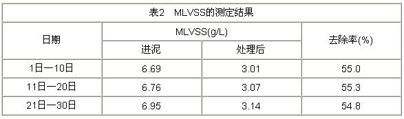 筆者在2002年3月以10d為一個(gè)周期,分別對(duì)進(jìn)泥的MLVSS和消化處理后的MLVSS進(jìn)行了測(cè)定,并取其平均值來(lái)評(píng)價(jià)消化池的處理效果,結(jié)果見(jiàn)表2。