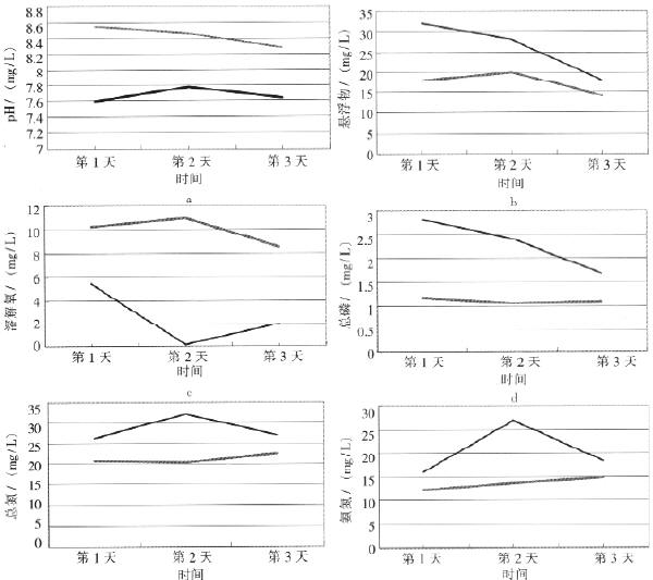(3) 夏秋季全部河水經(jīng)本工藝處理后, 達(dá)到以下水質(zhì)指標(biāo): ①河水無臭味; ②CODCr 為70~80 mg / L,BOD5 為25 ~28 mg / L, NH3- N 為12 mg / L, 溶解氧為2 mg/ L。