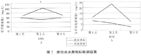 分別對(duì)進(jìn)出水水質(zhì)指標(biāo)進(jìn)行了取樣檢測, 檢測環(huán)境在室溫15.0 ~ 22.0 ℃、濕度30.0 %~ 50.0 %下進(jìn)行,檢測結(jié)果如圖2。