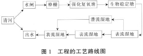 根據(jù)實(shí)際情況, 本項(xiàng)目確定以物理— 生物—生態(tài)技術(shù)相結(jié)合的綜合處理工藝, 對(duì)清河污水進(jìn)行治理。主要包括人工曝氣、生物穩(wěn)定塘、模擬自然河流通道、滲濾壩凈化、表流濕地、水生植物等。
