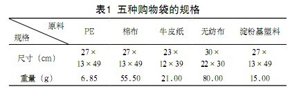 本文選用容積相同或相近的聚乙烯(PE)、牛皮紙、棉布、紡粘法無紡布(PP為主要原料)和淀粉基塑料(淀粉含量為90%,其余為PE等)五種購物袋作為研究對象[3] ,具體規(guī)格見表1。