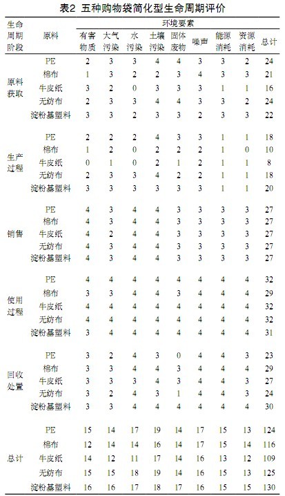 由上述評價(jià)結(jié)果可見,在沒有考慮固體廢棄物的情況下,聚乙烯塑料、無紡布和淀粉基塑料購物袋的主要環(huán)境指標(biāo)優(yōu)于其它兩種購物袋;牛皮紙購物袋的能耗大,水污染也較嚴(yán)重;棉布購物袋的主要環(huán)境問題是水耗大。如果考慮固體廢棄物,則淀粉基塑料和牛皮紙購物袋可以在自然條件下降解,無紡布購物袋和棉布購物袋的循環(huán)使用次數(shù)越多,其環(huán)保性能也就隨之提高。