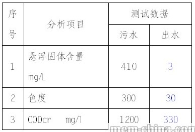 采用上述工藝配方,運(yùn)用SPR-0.5型高濁度污水凈化器及其系統(tǒng),在湖北XX蘆葦制漿造紙廠現(xiàn)場進(jìn)行了造紙中段廢水的連續(xù)開機(jī)運(yùn)行試驗(yàn),效果良好:凈化后出水的懸浮物SS<3毫克/升,濁度低于3度, PH 7,水質(zhì)透明,只殘存極淺的色度。