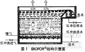 曝氣生物濾池的結(jié)構(gòu)與普通快濾池基本相同,不同之處在于曝氣生物濾池下部或底部增加了曝氣系統(tǒng)。根據(jù)水流方向其可分為上向流和下向流兩種,早期的曝氣生物濾池多采用下向流,如BIOCARBON[4]。由于下向流曝氣生物濾池的納污效率不高、易堵塞 、運(yùn)行周期短,因此現(xiàn)在多采用上向流方式(即采用氣水同向流),使布水、布?xì)飧泳鶆。同時(shí),在水氣上升過(guò)程中可把底部截留的SS帶入濾池中上部,增加了濾池的納污能力,延長(zhǎng)了工作周期。目前,上向流曝氣生物濾池有BIOFOR®、BIOSTY®、COLOX®、DeepBedTM、BIOPUR®R等多種形式[5、6],其中BIOFOR&R應(yīng)用最為廣泛,圖1是BIOFOR®的結(jié)構(gòu)示意圖。