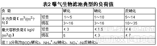 曝氣生物濾池一般采用兩種負(fù)荷:容積負(fù)荷[kg/(m3?d)]和水力負(fù)荷[m3/(m2?h ),也稱(chēng)濾速]。早期的曝氣生物濾池均采用了較低的負(fù)荷值,但隨著對(duì)曝氣生物濾池研究的深入和認(rèn)識(shí)水平的提高,負(fù)荷值近幾年有逐漸加大的趨勢(shì)。表2是較為典型的負(fù)荷值。