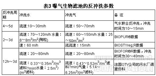 目前,普遍采用的反沖洗方式是氣水聯(lián)合反沖洗,即先用氣沖,再用氣、水聯(lián)合沖洗,最后再用水漂洗。不同形式、不同濾料的曝氣生物濾池,其反沖洗強(qiáng)度、歷時(shí)、周期各不相同,用水量和用氣量也存在較大差異。表3是一些資料提供的曝氣生物濾池采用的反沖洗參數(shù)。
