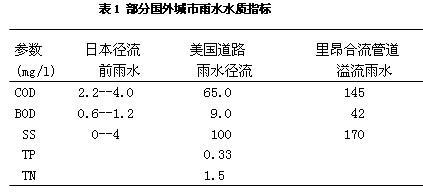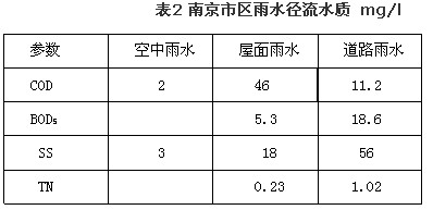 雨水在降落過(guò)程中,空氣中的溶解性氣體,溶解或懸浮狀固體,重金屬及細(xì)菌等會(huì)進(jìn)入其中。地表徑流中的污染物主演來(lái)自降雨對(duì)地表的沖刷。所以地表沉積物是地表徑流中污染物的主要來(lái)源。地表沉積物的組成決定著地表徑流污染的性質(zhì)。地表沉積物包括許多污染物質(zhì),有固態(tài)廢棄物碎屑(城市垃圾、動(dòng)物糞便、城市建筑施工場(chǎng)地堆積物)化學(xué)藥品(草坪施用的化肥農(nóng)藥)、車(chē)輛排放物等。具有不同土地使用功能的地表其沉積物的來(lái)源不同。因而,雨水的水質(zhì)會(huì)因地點(diǎn)、時(shí)間的不同而有所差異。一般雨水水質(zhì)主要考慮BOD、 COD 、SS 、TN等的濃度。表1為國(guó)外部分城市雨水水質(zhì)指標(biāo)[2]。表2 為南京市區(qū)雨水徑流水質(zhì)[2]。