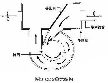 澳大利亞某公司將傳統(tǒng)的篩網(wǎng)過(guò)濾器進(jìn)行改進(jìn),研發(fā)出了一種新型的雨水凈化設(shè)備。圖3[3]為其剖面圖。在離心和重力作用下,該設(shè)備不僅可截留大于濾網(wǎng)的顆粒,還可截留小于濾網(wǎng)的顆粒,大大提高了凈化效率。同時(shí),由于雨水是由側(cè)面掠過(guò)濾網(wǎng)的,因而濾網(wǎng)有一定的沖刷作用。該設(shè)備的另一優(yōu)點(diǎn)在于不需動(dòng)力操作。這在很大程度上降低了處理成本,具有較強(qiáng)的實(shí)用價(jià)值。