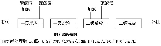 含高濃度氮磷的初期雨水的物化處理采用的是兩級(jí)藥劑混凝沉淀法[4]。一級(jí)反映投加磷酸鈉、硫酸鎂,且加堿調(diào)pH值呈中性,產(chǎn)生磷酸鋁沉淀,去除污水中的磷。