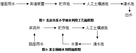 在我國(guó)對(duì)于土壤過(guò)濾系統(tǒng)也有一定的應(yīng)用。北京市某小學(xué)[6]以及某公園[7]就利用土壤過(guò)濾處理雨水。其流程圖見(jiàn)圖7和圖8: