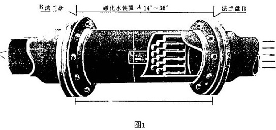 目前國內(nèi)已有四項關(guān)于磁水器的專利,這些專利通過選用不同的磁性材料和水流的通路形式來達到使水磁化的目的(3)。如圖1所示的磁化水裝置外型為管狀,采用不銹鋼管制作,兩端帶法蘭盤可與管道直接相連。磁化水裝置內(nèi)部采用兩組N,S極相對的特殊合金永磁材料制成的磁棒,按照N-S,N-S排列,磁場能量很高,可高達6000高斯,使用期限為25年,磁場強度衰減率為3%,由于磁化裝置使用的是永久磁性材料,無須外加電源,不耗電能。結(jié)構(gòu)簡單,不需要做任何調(diào)整,也不需要特殊的保養(yǎng)與維護,而且裝置安裝十分方便,并且不占地。