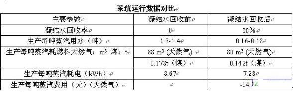 (1)凝結(jié)水回收后比回收前生產(chǎn)每噸蒸汽節(jié)約用水量≥80%;每噸蒸汽的燃料消耗,天然氣消耗減少8 m3,燃煤鍋爐房的燃料煤減少0.036t;生產(chǎn)每噸蒸汽的耗電量減少1.5kWh左右。