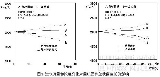 實(shí)際的污水處理廠負(fù)荷是變化的,實(shí)驗(yàn)發(fā)現(xiàn)在停留時(shí)間3、4和5h.下,系統(tǒng)的溶解氧濃度分別為1.2,2.2和3.0mg/l。圖3是流量和基質(zhì)增加幅度為1.5倍采用計(jì)算機(jī)模擬結(jié)果。在穩(wěn)定的流量和濃度條件下,長(zhǎng)期運(yùn)行是菌膠團(tuán)細(xì)菌占優(yōu)勢(shì)。流量或是基質(zhì)濃度的變化會(huì)造成絲狀菌的過(guò)度生長(zhǎng),而絲狀菌的生長(zhǎng)不是一簡(jiǎn)單的可逆過(guò)程,結(jié)果會(huì)造成了污泥沉降性能的變化。值得說(shuō)明的是上述結(jié)果是在相對(duì)高的負(fù)荷下的模擬結(jié)果,研究表明對(duì)低負(fù)荷結(jié)果相反。