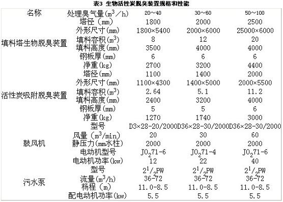 日本某公司生產(chǎn)的生物活性炭脫臭裝置規(guī)格和性能見表3所示: