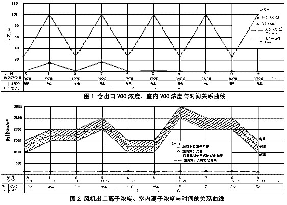 9小時連續(xù)運行,臭源VOC濃度周期性變化從25~100ppm,室內(nèi)則從15~16.7ppm逐漸衰減到0~1ppm;室內(nèi)測點離子濃度始終保持在160~170Ions/cm3;H2S氣體濃度也保持為0。