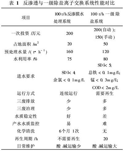 3.1 反滲透與一級除鹽離子交換系統(tǒng)性能對比 反滲透與一級除鹽離子交換系統(tǒng)性能對比見 表1。