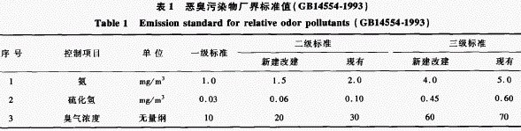 在城市污水處理廠污水與污泥處理過程中有大量的惡臭氣體產(chǎn)生,不僅帶來感官上的不悅,而且對(duì)人體健康及生態(tài)環(huán)境還會(huì)造成嚴(yán)重危害。發(fā)臭物質(zhì)主要有硫化氫、氨和硫醇等。隨著人類社會(huì)經(jīng)濟(jì)的發(fā)展,人民生活水平的提高和公眾環(huán)保意識(shí)的增強(qiáng),城市污水處理廠在運(yùn)行過程中所產(chǎn)生的臭氣問題,已經(jīng)引起社會(huì)越來越多的關(guān)注。許多發(fā)達(dá)國家制定了相關(guān)的法律法規(guī),嚴(yán)格控制臭味氣體的排放。在設(shè)計(jì)污水處理系統(tǒng)時(shí),臭味氣體的處理也作為重要組成部分。據(jù)報(bào)道,1987年日本城市污水廠約有166座脫臭裝置治理惡臭物質(zhì)[1-4]。在20世紀(jì)90年代初,我國就制定了惡臭氣體的排放標(biāo)準(zhǔn)(GB14554—1993),并開展了相關(guān)的研發(fā)工作[5-9]。相關(guān)的排放物標(biāo)準(zhǔn)列于表1。