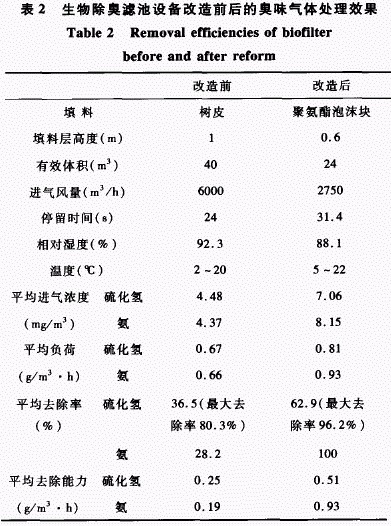 經(jīng)上述設(shè)備改造后,生物除臭濾池運(yùn)行了7個(gè)月。臭味氣體的去除效果明顯提高。設(shè)備改造前后生物除臭濾池的運(yùn)行條件及臭味氣體的去除效果列于表2。