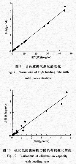 進(jìn)氣濃度和氣體流量發(fā)生變化均能引起負(fù)荷的改變?刂七M(jìn)氣口的氣體流量是除臭系統(tǒng)的一項(xiàng)重要系統(tǒng)參數(shù)。不同的流速是否會(huì)影響到除臭的效果,當(dāng)流速過大時(shí),氣體中的有害物質(zhì)與微生物的接觸時(shí)間過短,未及時(shí)被微生物降解就已經(jīng)溢出。流速過小,使總處理量減小,不能滿足處理需求。由于進(jìn)入除臭濾池的氣體流量保持2750 m /h,因此負(fù)荷的變化主要由進(jìn)氣濃度的變化引起。硫化氫的進(jìn)氣濃度與負(fù)荷成正比(圖9)。去除能力與負(fù)荷也成正比關(guān)系(圖10),負(fù)荷增加,去除能力明顯提高。在較高的負(fù)荷下,可以獲得較高的硫化氫的去除能力。