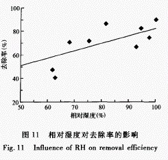 濕度的控制對(duì)于生物除臭濾池的運(yùn)行非常重要,干燥的環(huán)境會(huì)使微生物體內(nèi)的蛋白質(zhì)變性,引起代謝活動(dòng)停止[10]。水是微生物生長所必不可少的,水在細(xì)胞中起到溶劑與運(yùn)輸介質(zhì)的作用,營養(yǎng)物質(zhì)的吸收與代謝產(chǎn)物的分泌必須以水為介質(zhì)才能完成。因?yàn)樗谋葻崛莞,是熱的良好?dǎo)體,能有效地吸收代謝過程中產(chǎn)生的熱并及時(shí)地將多余熱量散發(fā),從而有效地控制細(xì)胞內(nèi)溫度的變化。所以填料保持適宜的含水率和濕度,能夠使微生物保持降解活性,使生物除臭濾池能夠長期穩(wěn)定運(yùn)行。通常生物濾池的含水率一般控制在40% ~80%,相對(duì)濕>99% 。氣體的相對(duì)濕度對(duì)去除效果的影響試驗(yàn)結(jié)果表明(圖11):在相同條件下(硫化氫的平均進(jìn)氣濃度為1.75 ms/m ,溫度為18.5℃),較高的硫化氫去除率是在較高的相對(duì)濕度(>80%)條件下獲得的;相對(duì)濕度較低時(shí),去除率也較低。實(shí)際中,通過調(diào)節(jié)噴淋系統(tǒng)的噴淋量、噴淋時(shí)間和噴淋次數(shù),可以有效地使填料保持適合微生物生長的濕度條件。