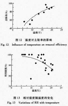除必需的營養(yǎng)成分以外,微生物的生長還需要適宜的溫度,適宜的溫度可以使微生物大量生長繁殖。一般地,溫度高,生物反應(yīng)器的去除能力也高。但是,過高過低的溫度均會(huì)降低微生物的代謝速率和生長速率[10-11],降低對(duì)氣體中發(fā)臭物質(zhì)的吸附能力和降解能力。溫度過低會(huì)造成微生物的活性降低處于休眠狀態(tài),溫度過高則會(huì)導(dǎo)致微生物大量的死亡。平均進(jìn)氣濃度為7.04 ms/nl ,溫度在5~22℃時(shí),硫化氫的去除率隨溫度的變化情況如圖12所示。在不同的溫度條件下,生物除臭濾池對(duì)硫化氫的去除效果有明顯的差異。隨著溫度的升高,硫化氫的去除率提高顯著。溫度對(duì)硫化氫的去除效果有明顯的影響。除臭濾池內(nèi)的溫度對(duì)氣體的相對(duì)濕度也有影響,當(dāng)溫度高于20~C時(shí),生物除臭濾池對(duì)硫化氫有較高的去除率。圖13顯示了氣體相對(duì)濕度隨溫度的變化情況。在15~C以下時(shí),氣體的相對(duì)濕度無明顯變化;隨著溫度的升高,氣體的相對(duì)濕度明顯下降,但仍可保持80% 以上。
