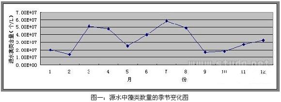 進(jìn)廠源水中的藻類數(shù)量隨季節(jié)變化而變化,在三、四月份和七、八月份有兩個明顯的高峰期(圖一),此時期也是源水濁度較高的時期,如能采取有效的措施去除藻類,就能有效地降低濁度,提高水質(zhì)。