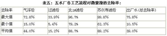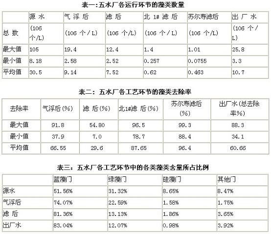 由此可見在五水廠的現(xiàn)行工藝中,除藻效率最高的環(huán)節(jié)是氣浮,但也只能除去66.5%的藻類,而濾池的作用極其有限。