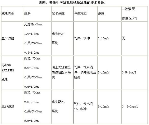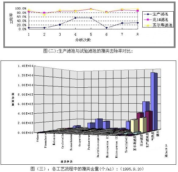 微絮凝過濾是一種可充分發(fā)揮濾池中濾料截污能力的凈水工藝,能夠有效地提高出水水質(zhì),特別是對常規(guī)工藝難以去除的藻類具有良好的去除效果。在實驗室濾柱小試的基礎(chǔ)上,我們建造了一過濾面積為3M2的蘇爾壽(SULZER)濾池(具體參數(shù)見表四)進(jìn)行中試,然后用五水廠原北1#濾池進(jìn)行生產(chǎn)性試驗。在試驗過程中,將北1#濾池原雙層濾料中的無煙煤更換為陶粒濾料并進(jìn)行了相應(yīng)的技術(shù)改造(見表四)。在將北1#濾池和蘇爾壽(SULZER)濾池作為微絮凝過濾試驗濾池與普通生產(chǎn)濾池進(jìn)行的對比試驗中,我們發(fā)現(xiàn)采用微絮凝過濾的北1#濾池和蘇爾壽(SULZER)試驗濾池,除藻效率極高,對于氣浮后水中的藻類的去除率平均都分別高達(dá)87.65%和96.4%(見表二),加上氣浮工藝除去的藻類,總?cè)コ识荚?8%以上。圖(三)清楚地表明實驗濾池濾后水中的藻類含量遠(yuǎn)遠(yuǎn)低于普通濾池濾后水中的藻類含量,從圖(二)也可看出實驗濾池的藻類去除率遠(yuǎn)遠(yuǎn)高于普通濾池的藻類去除率.可見采用微絮凝過濾是去除藻類,提高水質(zhì)最有效的途徑,也是目前采用常規(guī)工藝處理高藻水的水廠比較經(jīng)濟(jì)實用的選擇。