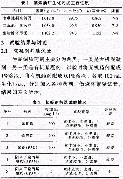 煉油廢水處理一般采用隔油、浮選和生化等處理工藝, 由此產(chǎn)生的污泥主要有:隔油池底泥、浮選池浮渣和生化處理過程中產(chǎn)生的生化污泥等.它們統(tǒng)稱為煉油廢水處理系統(tǒng)的三泥(或三渣)。隔油池底泥和浮選池浮渣由于含油較高,常采用兩相或三相分離脫水的方法使污泥中的油得以回收利用。而生化處理產(chǎn)生的生化污泥由細菌、微生物、有機物、油等組成.污泥量大,極易發(fā)臭,含水率高,又難脫水。本文對煉油廢水生化處理污泥的脫水減容進行了研究。