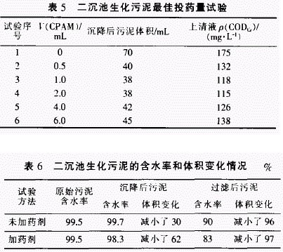 二沉池生化污泥的污泥沉降比較高,達50%~70%,污泥的含水率為99.5%左右, 比較容易沉降,可直接投入絮凝劑進行試驗。試驗結(jié)果如表5和表6所示。