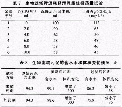 生物濾塔污泥的污泥沉降比非常高.接近100%.污泥含水率為94.3%左右,呈膠體狀態(tài),粘性大,幾乎不沉降,脫水困難。對原始污泥直接加藥,無明顯效果.因此需加水稀釋。試驗得出最佳污泥稀釋比為1:6, 即1份體積的污泥加入6份體積的水。將污泥按1:6稀釋后進行試驗,試驗結(jié)果如表7和表8所示。
