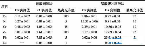 目前世界上固體廢物浸出毒性試驗(yàn)方法很多,這些方法都可以評估污染物在環(huán)境中的潛在浸出性,但是使用不同的方法可能會得出差別顯著的結(jié)論,所以危險(xiǎn)廢物定性問題一直困擾著環(huán)保工作者。本研究分別采用固體廢物毒性浸出方法——硫酸硝酸法和醋酸緩沖液法,比較鑒別電鍍污泥(ES)和垃圾焚燒飛灰(FA)的危險(xiǎn)特性差異,結(jié)果見表3。由表可知,2種方法均認(rèn)為飛灰具有浸出毒性,屬于危險(xiǎn)廢物。按照硫酸硝酸法浸出毒性鑒別標(biāo)準(zhǔn),飛灰浸出液中Pb濃度超標(biāo),而按照醋酸緩沖液法浸出毒性鑒別標(biāo)準(zhǔn),Pb濃度嚴(yán)重超標(biāo),超標(biāo)5倍多,且Cr濃度也臨近超標(biāo)。電鍍污泥而言,2種方法鑒別結(jié)果不一致,硝酸硫酸法鑒別結(jié)果沒有顯示超標(biāo),而醋酸緩沖液法鑒別結(jié)果表明Ni濃度已經(jīng)超出最高允許值。說明2種浸出方法對危險(xiǎn)廢物的定性鑒別結(jié)果卻不盡相同。醋酸緩沖法浸出的重金屬含量基本高于硫酸硝酸的浸出方法,有學(xué)者認(rèn)為醋酸對堿度的緩沖作用以及醋酸根離子對金屬的絡(luò)合能力是產(chǎn)生醋酸緩沖法重金屬浸出濃度高的主要原因[4-5]。