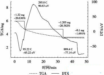 本研究采用的熱重分析試驗(yàn)裝置是島津公司DTG-60型號綜合熱分析儀器,N2氣下爐溫最高可達(dá)1200℃,設(shè)計(jì)試驗(yàn)工況以標(biāo)準(zhǔn)氮?dú)庾鳛檩d氣,氣體流量設(shè)定為30mL/min,試驗(yàn)升溫速率分別為20℃/min,試驗(yàn)終溫在900℃,對不同物料的熱重(TGA)、微商熱重(DTG)和差熱分析(DTA)進(jìn)行了分析,TGA曲線反映了物料樣品在升溫過程中的失重,DTG曲線顯示了在各個(gè)時(shí)刻的樣品失重速率,而DTA曲線則代表樣品與參比物之間的溫度差。