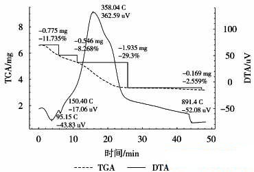 圖2為制革污泥在氮?dú)庾鳛檩d氣,以20℃/min升溫速率的失重曲線TGA和差熱曲線DTA。由圖可見,制革污泥的失重過程分為4個(gè)階段。30~120℃之間為升溫初始階段,因試樣為風(fēng)干樣,此階段制革污泥的外在水急劇蒸發(fā),失重較大,達(dá)到11.735%;120~200℃為放熱失重階段,從TGA曲線中可以看出,這一階段的TGA曲線也較為陡峭,失重達(dá)8.268%,DTA曲線顯示,在150℃有一個(gè)較小的吸熱峰,可能是由于制革污泥存在較多的不穩(wěn)定小分子,升溫過程中揮發(fā)失重造成的;200~520℃為吸熱急劇失重階段,TGA曲線陡峭,失重為29.3%,且在358.04℃,DTA曲線出現(xiàn)了整個(gè)反應(yīng)過程中的最高峰值。該溫度段失重可能是由制革污泥中高分子發(fā)生分解、燃燒等一系列劇烈的化學(xué)反應(yīng)所致;520℃以后,反應(yīng)基本結(jié)束,此時(shí)的TGA曲線波動(dòng)較小,說明反應(yīng)產(chǎn)物的化學(xué)成分基本保持不變,但TGA曲線并沒有走平,造成這種現(xiàn)象的原因可能是表面生成的反應(yīng)產(chǎn)物阻礙了剩余物料的進(jìn)一步分解,當(dāng)溫度達(dá)到試驗(yàn)設(shè)定的結(jié)束溫度時(shí),TGA失重過程仍在繼續(xù)。以上綜合表明,520℃之前可以有效的去除水分、揮發(fā)份以及有機(jī)質(zhì)物,減容減重效果明顯,焚燒處置具有一定可行性。但對于焚燒煙氣的二次污染,重金屬價(jià)態(tài)的變化及其毒性變化還有待進(jìn)一步研究。