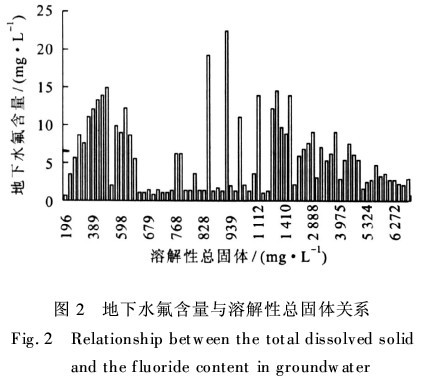 地地下熱水中溶解性總固體含量達(dá)到930 mg/L時(shí),地下熱水中氟含量達(dá)到峰值(如圖2所示),推測(cè)我國(guó)地溫影響類高氟水普遍有此特點(diǎn)。