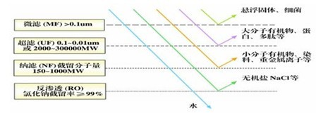 常用的以壓力為推動(dòng)力的膜分離技術(shù),有微濾(MF)、超濾(UF)、納濾(NF)以及反滲透(RO)等工藝方法。膜分離技術(shù)能夠提供穩(wěn)定可靠的水質(zhì).其分離水中雜質(zhì)的主要機(jī)理是機(jī)械篩濾作用,因而出水水質(zhì)在很大程度上取決于濾膜孔徑的大小。