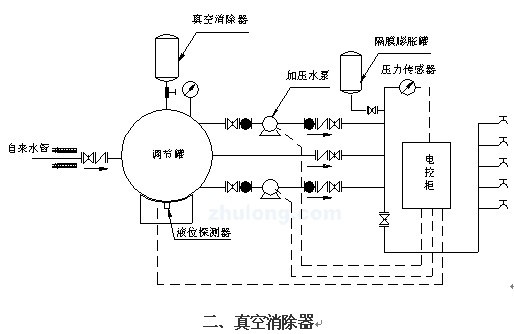 自來水管網的水直接進入調節(jié)罐,罐內的空氣從真空消除器內排出,待水充滿后,真空消除器自動關閉。當自來水能夠滿足用水壓力及水量要求時,設備通過旁通止回閥向用水管網直接供水;當自來水管網的壓力不能滿足用水要求時,系統(tǒng)通過壓力傳感器(或壓力控制器、電接點壓表)給出起泵信號起動水泵運行。水泵供水時,若自來水管網的水量大于水泵流量,系統(tǒng)保持正常供水;用水高峰期時,若自來水管網水量小于水泵流量時,調節(jié)罐內的水作為補充水源仍能正常供水,此時,空氣由真空消除器進入調節(jié)罐,消除了自來水管網的負壓,用水高峰期過后,系統(tǒng)恢復正常的狀態(tài)。若自來水管網停水而導致調節(jié)罐內的水位不斷下降,液位探測器給出水泵停機信號以保護水泵機組。系統(tǒng)圖如下所示: