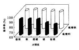 人工配制不同硬度水樣,按CaCO3換算后,極軟水、軟水、稍硬水、硬水、極硬水的硬度分別為35.2、83.4、152.3、438.6和553.8mg/L。從圖1可見,硫酸鐵對軟水中 砷去除效果最好,對極硬水中的砷去除效果較差。硫酸鋁對極軟水除砷效果最好,隨著水硬度的加大,其去除率亦降低,且變化幅度較硫酸鐵大。
